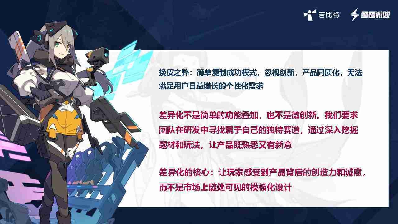 在我们内部是这么定义差异化的。。。首先,,,,差异化不是简单的功能叠加,,,更不是换皮。。只是换皮,,产品无法提供有效的市场价值。。。。内部经常说差异化的产品不是为了迎合市场,,而是找到一个自己独特的表达方式,,在研发中找到属于自己的细分赛道和独特赛道,,,前提是需要对这个题材有足够的深入、、、、挖掘,,对玩法有足够深入的理解,,让产品看起来既熟悉又有新意。。。