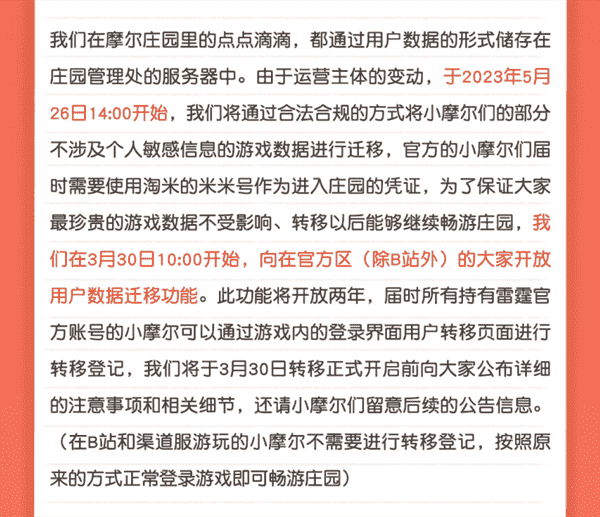 合作结束本就是开发方和代理方双方的事情,,,降低这件事情对玩家的影响,,才是对所有珍视这段童年的摩尔玩家最好的呵护。。目前看来,,,用户完全不用担心后续因无法登录游戏而造成任何数据上的损失,,,,只要及时进行账号转移,,,,就可以好好保留、、延续在庄园的痕迹和回忆,,,,继续在庄园里做快乐的红鼻子小鼹鼠。。。